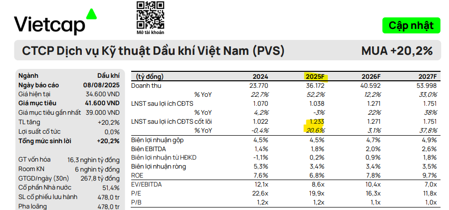 Trước đó, Vietcap (8.8.2025) cũng đã điều chỉnh tăng 7% giá mục tiêu lên 41,600 đồng/cổ phiếu và duy trì khuyến nghị MUA đối với PVS.