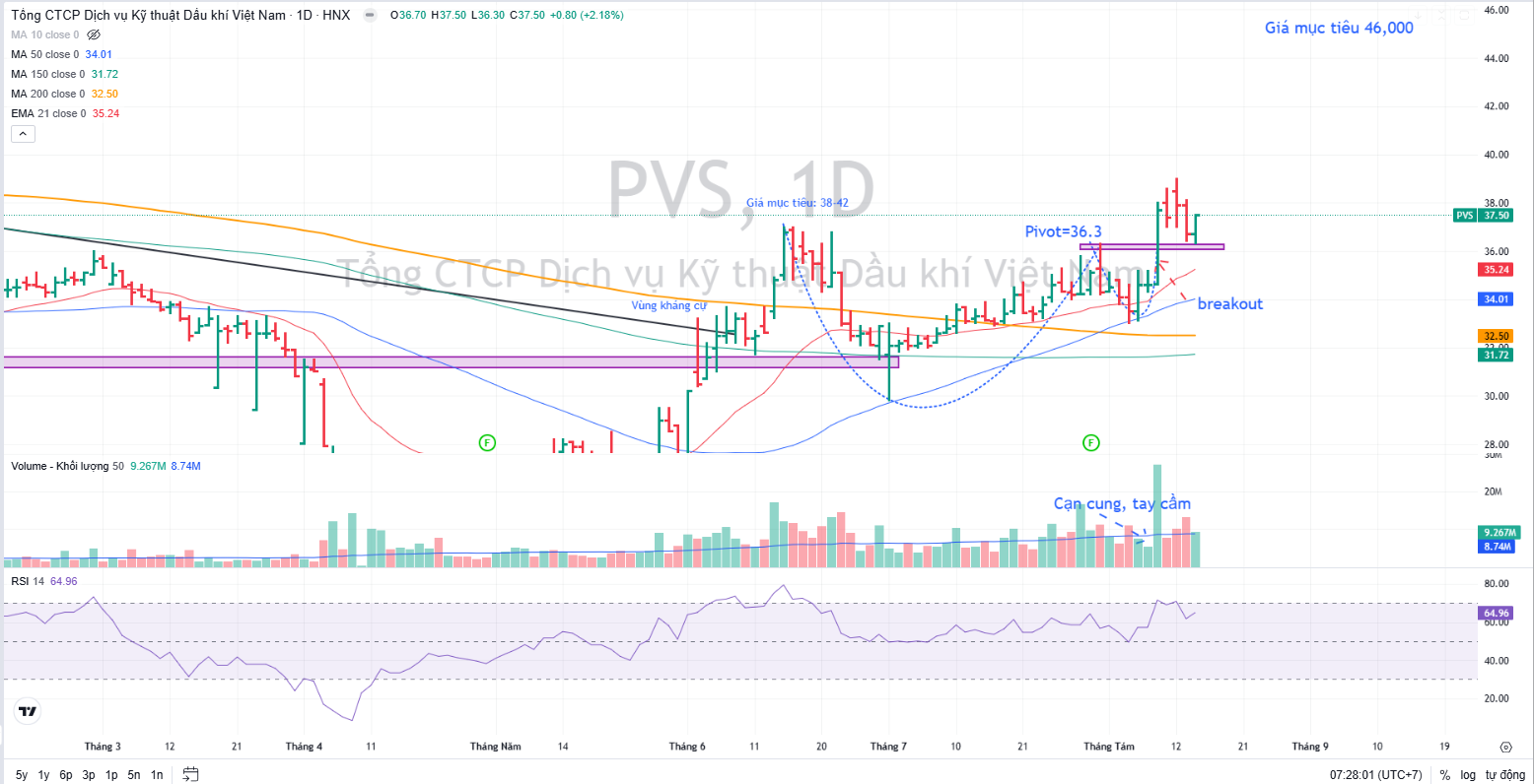 Trên đồ thị, PVS vừa kiểm tra lại điểm mua pivot=36,300 sau khi breakout mẫu hình Chiếc Cốc Tay Cầm. Việc kiểm tra thành công có thể mang tới cơ hội tiếp tục bổ sung vị thế sau điểm mua breakout. Hiện tại, Elibook Team chỉ dừng ở mức độ giải ngân thăm dò 5% NAV ở PVS. Rủi ro điều chỉnh của thị trường chung vẫn còn sau cú tăng giá mạnh gần 600 điểm trong 4 tháng qua, mà chưa có cú điều chỉnh nào trên 5%.