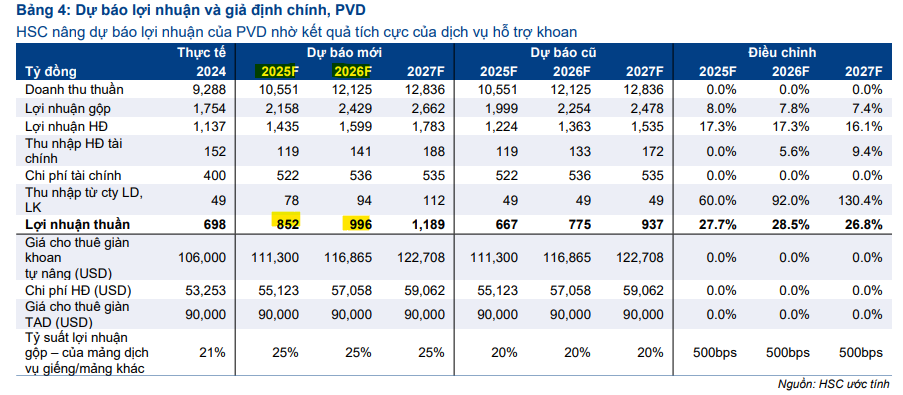 HSC (14.8.2025) duy trì khuyến nghị Mua vào nhưng đã nâng giá mục tiêu thêm 16% lên 27,500 đồng/cổ phiếu. Động lực chính đến từ sự cải thiện đáng kể của mảng dịch vụ kỹ thuật giếng khoan, với doanh thu và tỷ suất lợi nhuận gộp tăng cao nhờ các chiến dịch khoan trong nước.
