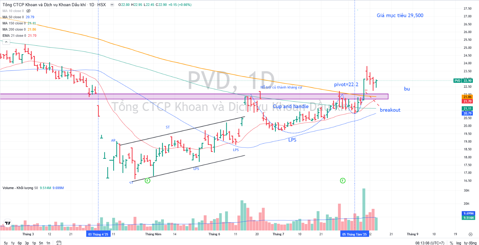 Trên đồ thị, PVD đang kiểm tra lại điểm mua 22,200 sau khi breakout Chiếc Cốc Tay Cầm. Việc kiểm tra thành công sẽ mang tới cơ hội mua gia tăng vị thế. Hiện tại, ELibook Team duy trì tỷ trọng 5% NAV ở PVD nhằm theo dõi phản ứng của PVD trước rủi ro điều chỉnh của thị trường chung.