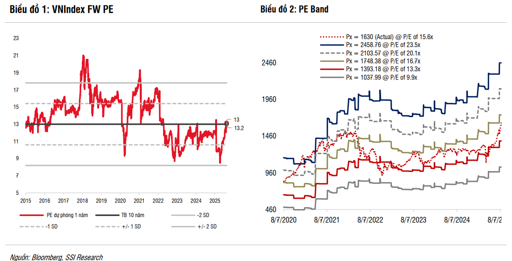 - Thực tế tăng tốc gần đây không đứng “trên cát”. Nền định lượng phía sau là: dự báo lợi nhuận toàn thị trường năm 2025 tăng khoảng 13.8%, với quỹ đạo nửa cuối năm nhích lên quanh mười lăm phần trăm; trong khi đó, hệ số định giá từ ngày 09/04 đến 15/08 đã từ 8.8 lần lên khoảng 13.2 lần — tức còn khoảng cách an toàn so với các đỉnh định giá lịch sử.