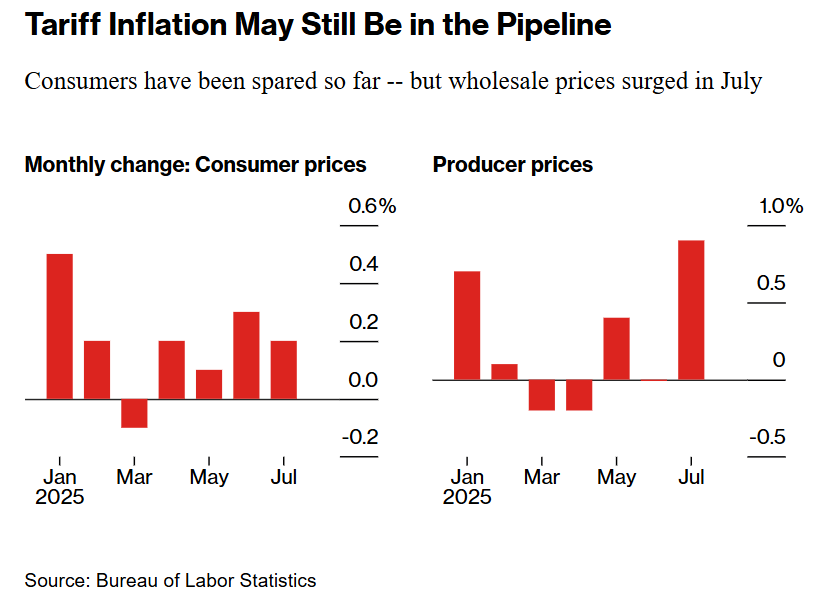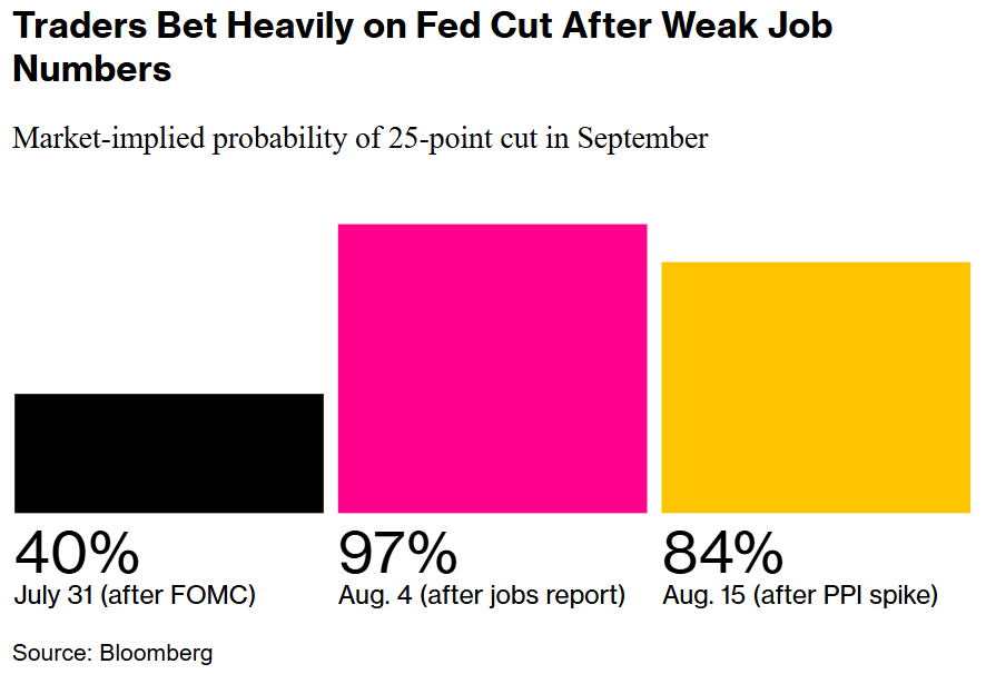 Lợi suất trái phiếu kỳ hạn 2 năm – vốn nhạy cảm nhất với chính sách Fed – đã lao dốc trong tháng này, khi nhà đầu tư nghiêng hẳn về kịch bản Fed giảm 0.25 điểm phần trăm vào tháng 9. Các cược này tăng mạnh sau báo cáo việc làm tháng 7 đầy thất vọng, vốn còn điều chỉnh giảm số liệu các tháng trước đó. Chỉ đến khi dữ liệu lạm phát bất ngờ cao tuần trước được công bố, kỳ vọng này mới dịu lại đôi chút.