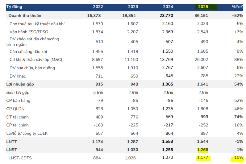 Vietcap dự báo LNST cốt lõi năm 2025 sẽ tăng 21% YoY nhờ doanh thu mảng M&C tăng mạnh, nhưng LNST báo cáo có thể giảm 3% YoY do giả định PVS sẽ trích lập thêm dự phòng. Tuy nhiên, lợi nhuận được kỳ vọng sẽ tăng mạnh trở lại 22% trong năm 2026 khi các khoản chi phí bất thường không còn.