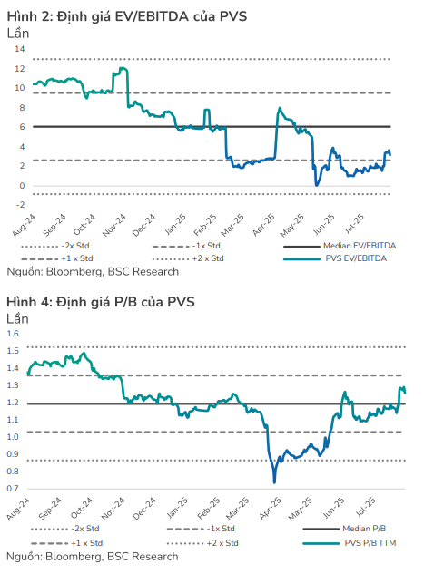 Mặc dù vậy, BSC (18.8.2025) đã nâng giá mục tiêu năm 2026 lên 42,800 VND/cổ phiếu, tăng 11% so với giá mục tiêu trước đó. Việc nâng giá này chủ yếu do BSC tăng P/E mục tiêu từ 16x lên 17x để phản ánh kỳ vọng PVS sẽ thu hẹp khoảng cách định giá so với thị trường chung.