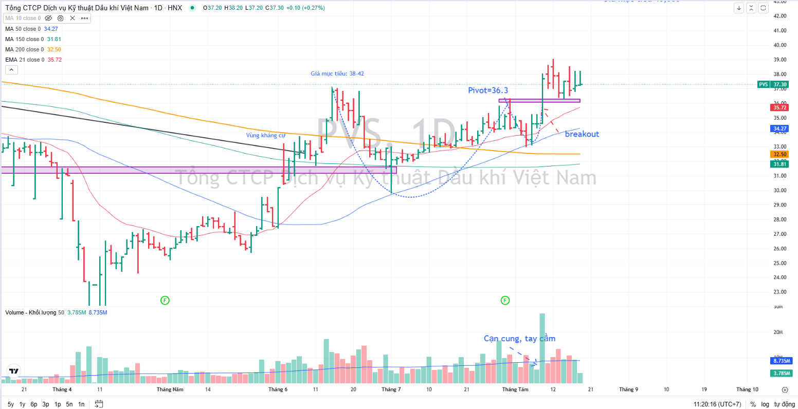 Trên đồ thị, PVS đang ở vùng mua hợp lý từ điểm breakout Chiếc Cốc Tay Cầm (5% từ điểm mua 36,300 đồng)