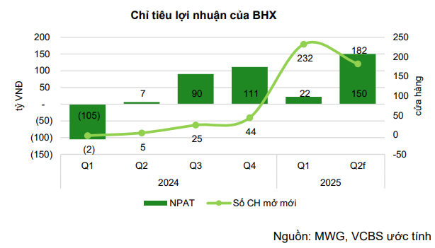 Mặc dù doanh thu/cửa hàng giảm nhẹ trong quý 2, lợi nhuận của chuỗi đã cải thiện nhờ tối ưu chi phí. BHX ước đạt khoảng 150 tỷ đồng lợi nhuận sau thuế trong quý 2 và mục tiêu cả năm được điều chỉnh tăng từ 500 tỷ đồng lên 600 tỷ đồng.