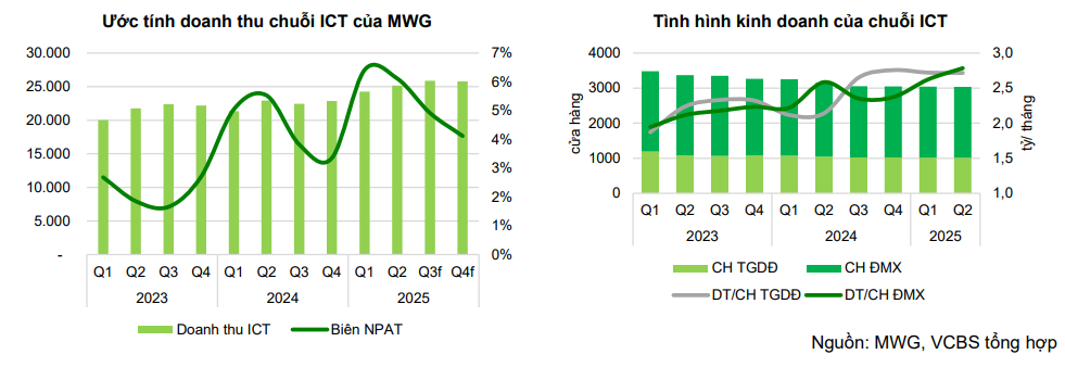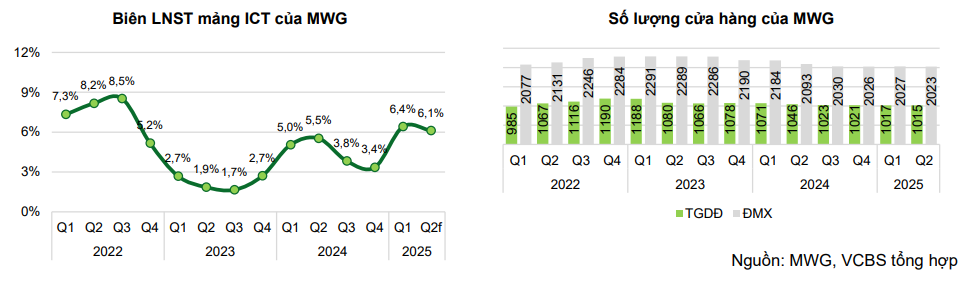 Sự phục hồi của mảng ICT được thúc đẩy bởi nhu cầu nâng cấp laptop để đáp ứng yêu cầu của Windows 11 và mùa tựu trường. Tăng trưởng doanh thu từ các sản phẩm của Apple đạt 60% so với cùng kỳ, giúp thị phần của MWG tăng lên 50%. Đây là cơ hội lớn để các nhà bán lẻ như TGDĐ và ĐMX vừa đẩy mạnh hiện diện online nhằm chiếm lĩnh thị phần TMĐT, vừa tận dụng sức mua công nghệ tăng mạnh trong mùa tựu trường. Nhờ chiến lược tối ưu chi phí vận hành, nâng cao hiệu quả bán hàng, kiểm soát tồn kho và giảm áp lực cạnh tranh giá, MWG đã cải thiện biên lợi nhuận ròng lên 4.7% trong 1H25, tăng gần 1 điểm % svck, tạo nền tảng cho tăng trưởng lợi nhuận bền vững trong các quý tới
