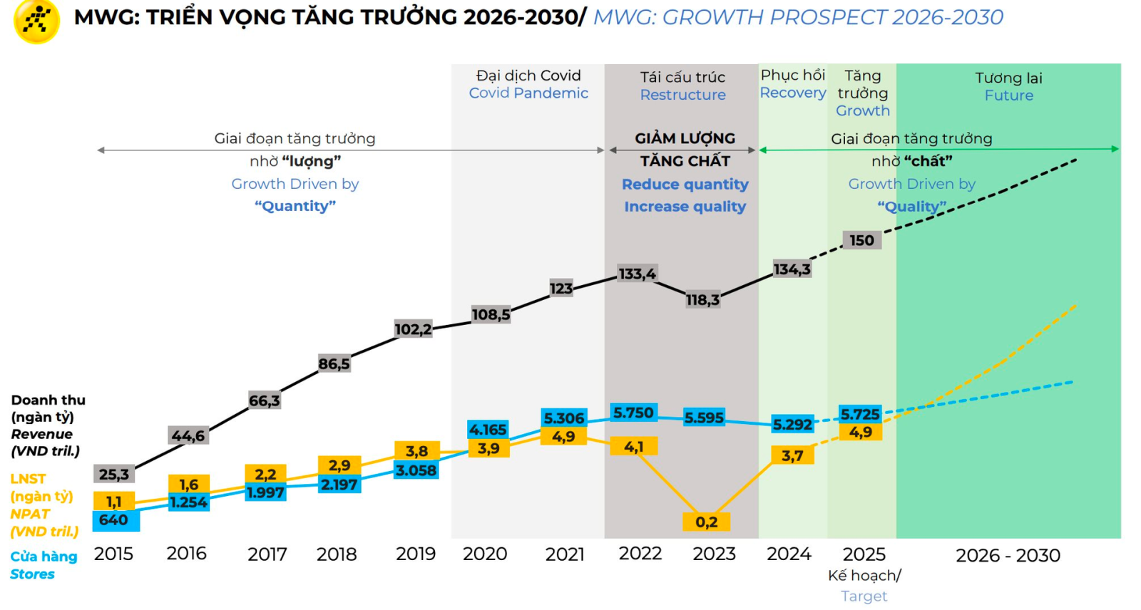 MWG đặt mục tiêu tăng trưởng doanh thu 15% trong năm 2025 và duy trì ở mức hai chữ số thấp trong trung hạn. Lợi nhuận sau thuế kỳ vọng tăng 15% mỗi năm trong giai đoạn 2026-2030, nhờ các dịch vụ hậu mãi và tối ưu chi phí.