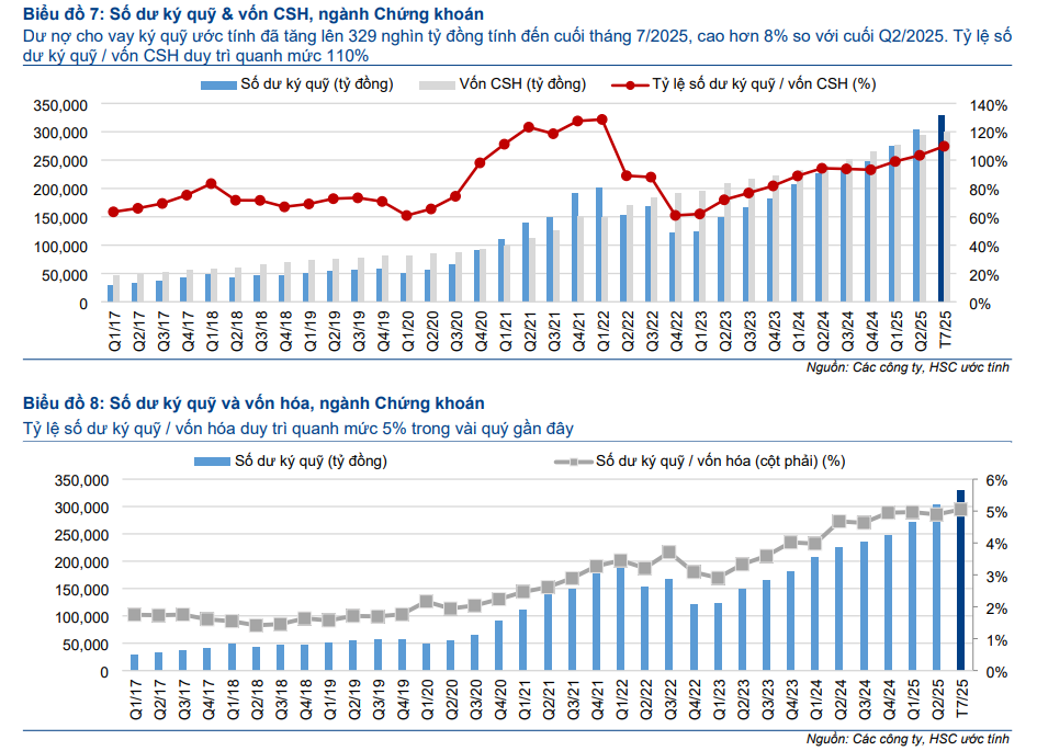 Tính đến cuối tháng 7/2025, dư nợ cho vay ký quỹ ước tính đạt 329 nghìn tỷ đồng, tăng 8% so với quý trước và tăng 33% so với đầu năm.