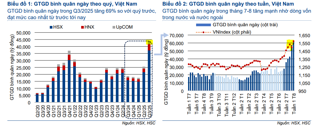 Chỉ số VNIndex đã vượt mốc 1,600 điểm vào tháng 8/2025 với thanh khoản tăng mạnh, được hỗ trợ bởi chính sách thuế quan rõ ràng và dòng vốn mạnh mẽ từ cả nhà đầu tư (NĐT) trong nước và nước ngoài. Dư nợ cho vay ký quỹ cũng đạt mức kỷ lục mới, cho thấy niềm tin của NĐT đã được cải thiện.
