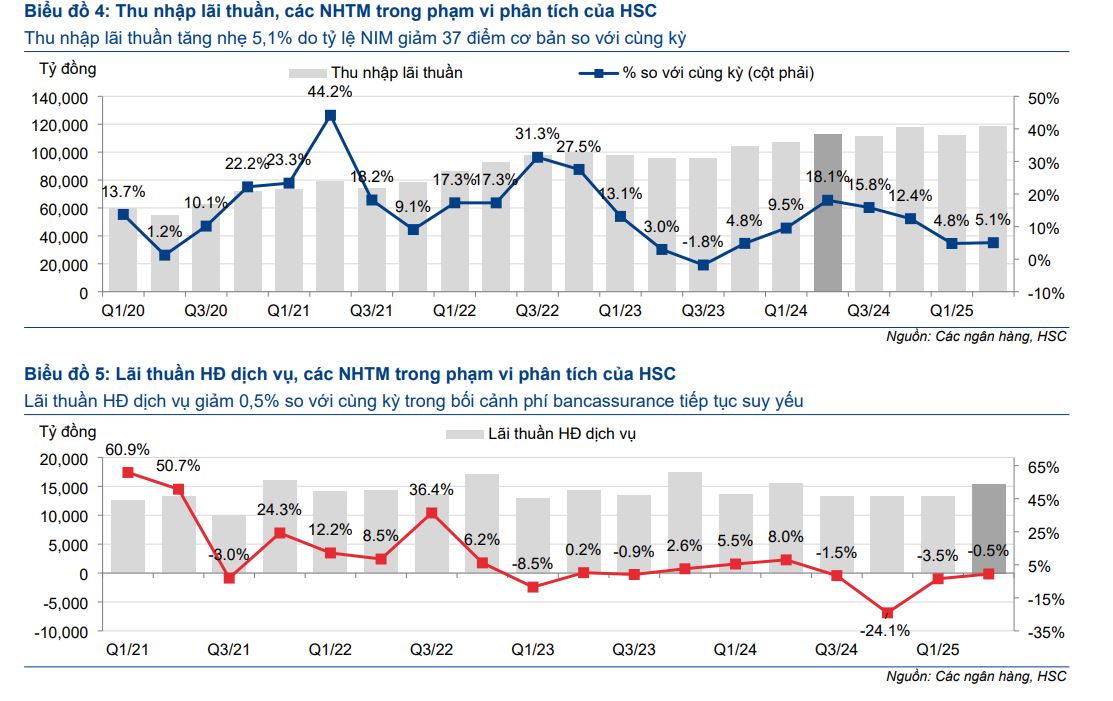 Trong khi đó, thu nhập lãi thuần chỉ tăng nhẹ 5.1% so với cùng kỳ, phản ánh áp lực lên tỷ lệ lợi nhuận ròng (NIM), dù tín dụng tăng trưởng khá cao. Hoạt động bancassurance vẫn kém tích cực, khiến thu nhập từ phí dậm chân tại chỗ.