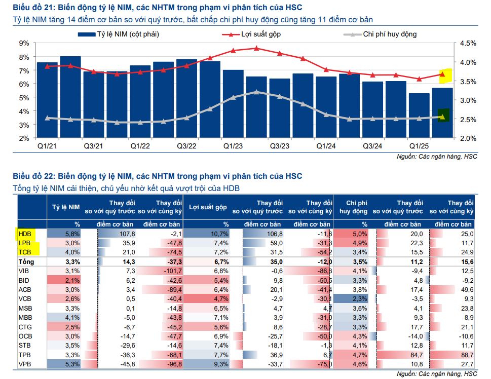 Tăng trưởng tín dụng mạnh mẽ nhưng huy động tiền gửi lại chậm hơn, đã gây áp lực lên lãi suất và khiến chi phí huy động tăng nhẹ. Tuy nhiên, Ngân hàng Nhà nước (NHNN) đã tích cực hỗ trợ thanh khoản qua nghiệp vụ OMO và tiền gửi Kho bạc Nhà nước, giúp giảm bớt áp lực huy động vốn. Nhờ đó, tỷ lệ NIM bình quân của ngành đã ổn định trở lại, tăng nhẹ 3 điểm cơ bản so với quý trước, cho thấy dấu hiệu tạo đáy sau nhiều quý sụt giảm.