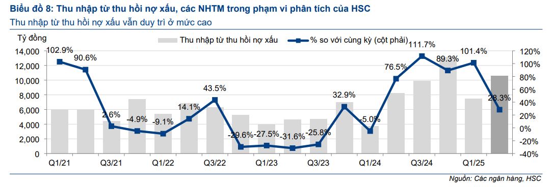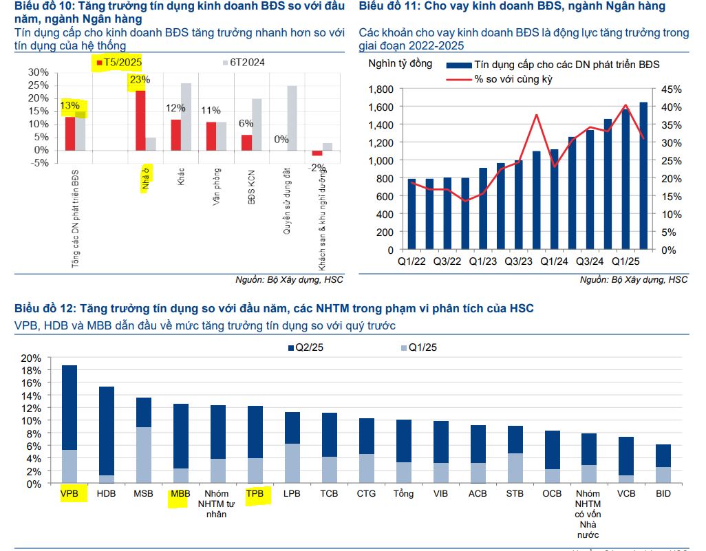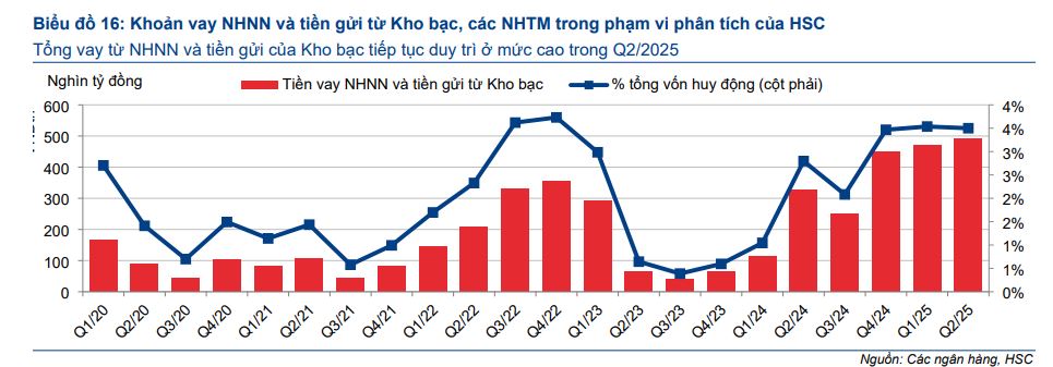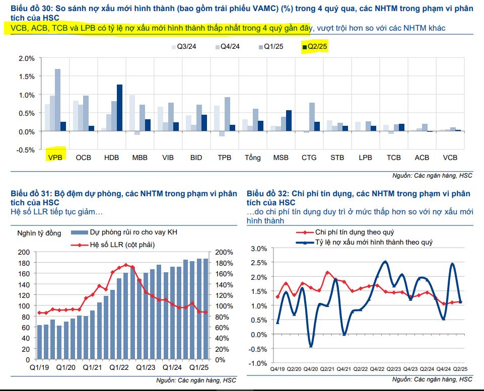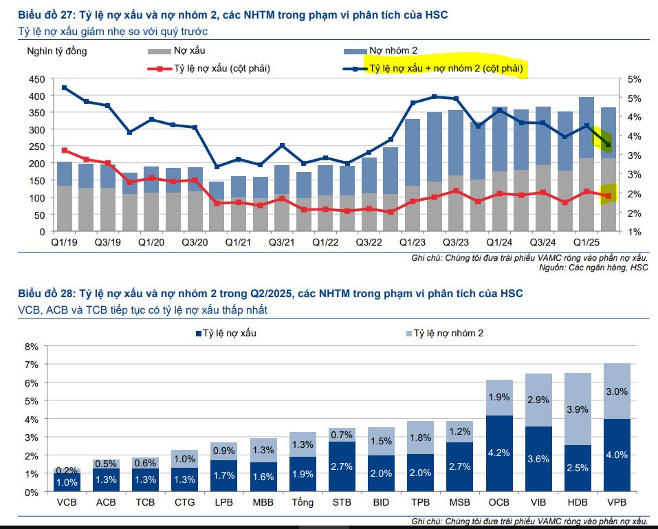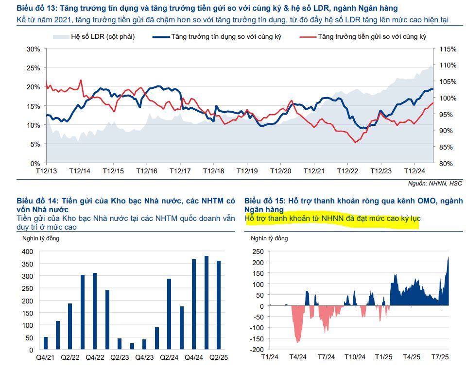 Trong 6 tháng cuối năm 2025, HSC kỳ vọng tăng trưởng tín dụng sẽ tiếp tục mạnh mẽ, có thể đạt 16-17% cả năm, nhờ chính sách hỗ trợ và việc NHNN nâng hạn mức tăng trưởng tín dụng. Tuy nhiên, rủi ro về chi phí huy động tăng lên vẫn hiện hữu nếu tăng trưởng tín dụng tiếp tục vượt xa tiền gửi. Bên cạnh đó, xu hướng chất lượng tài sản cần được theo dõi sát sao, đặc biệt trong bối cảnh những thách thức tiềm ẩn liên quan đến chính sách thuế quan.