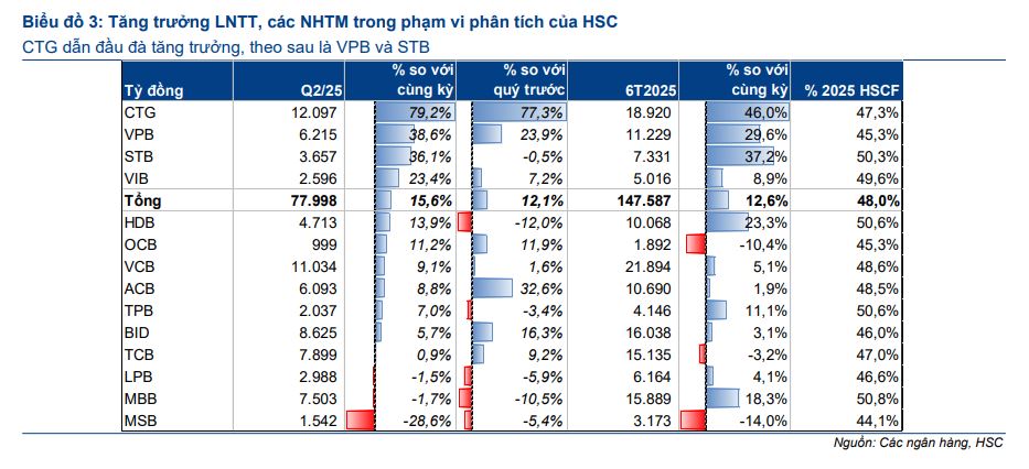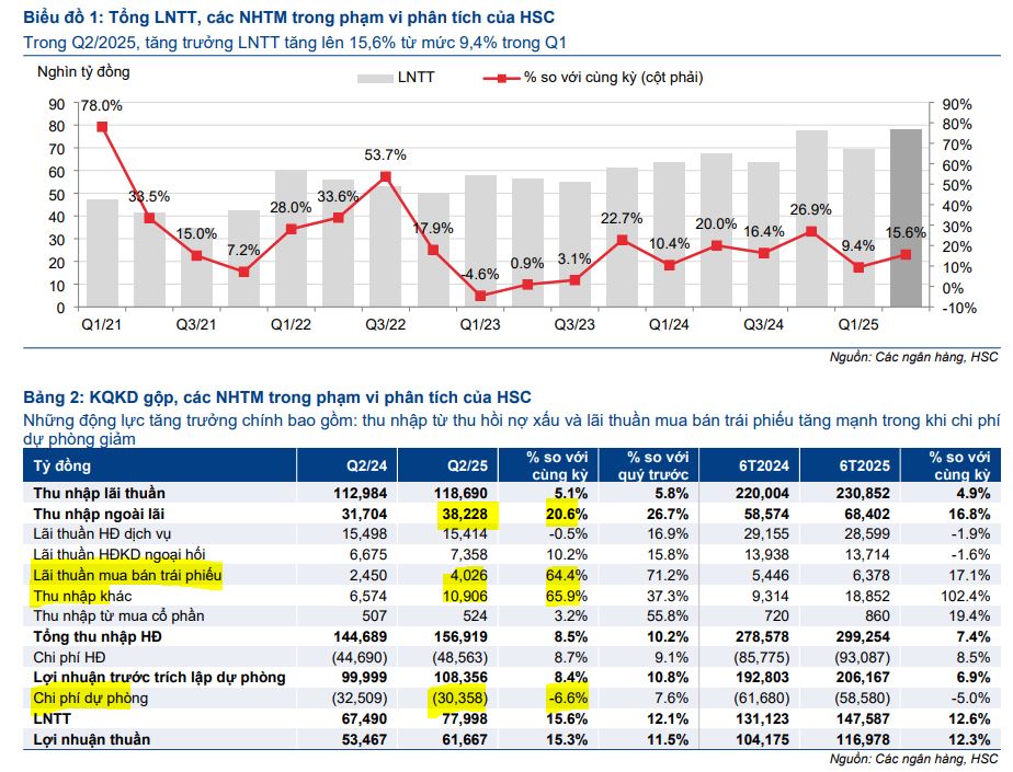 Theo phân tích của Công ty Chứng khoán HSC cho thấy, ngành ngân hàng Việt Nam đã ghi nhận một quý II/2025 với mức tăng trưởng lợi nhuận khiêm tốn, chủ yếu nhờ các yếu tố ngoài hoạt động kinh doanh cốt lõi. Mặc dù tăng trưởng tín dụng có dấu hiệu khởi sắc, song cần theo dõi chặt chẽ chi phí huy động và chất lượng tài sản trong những tháng cuối năm.