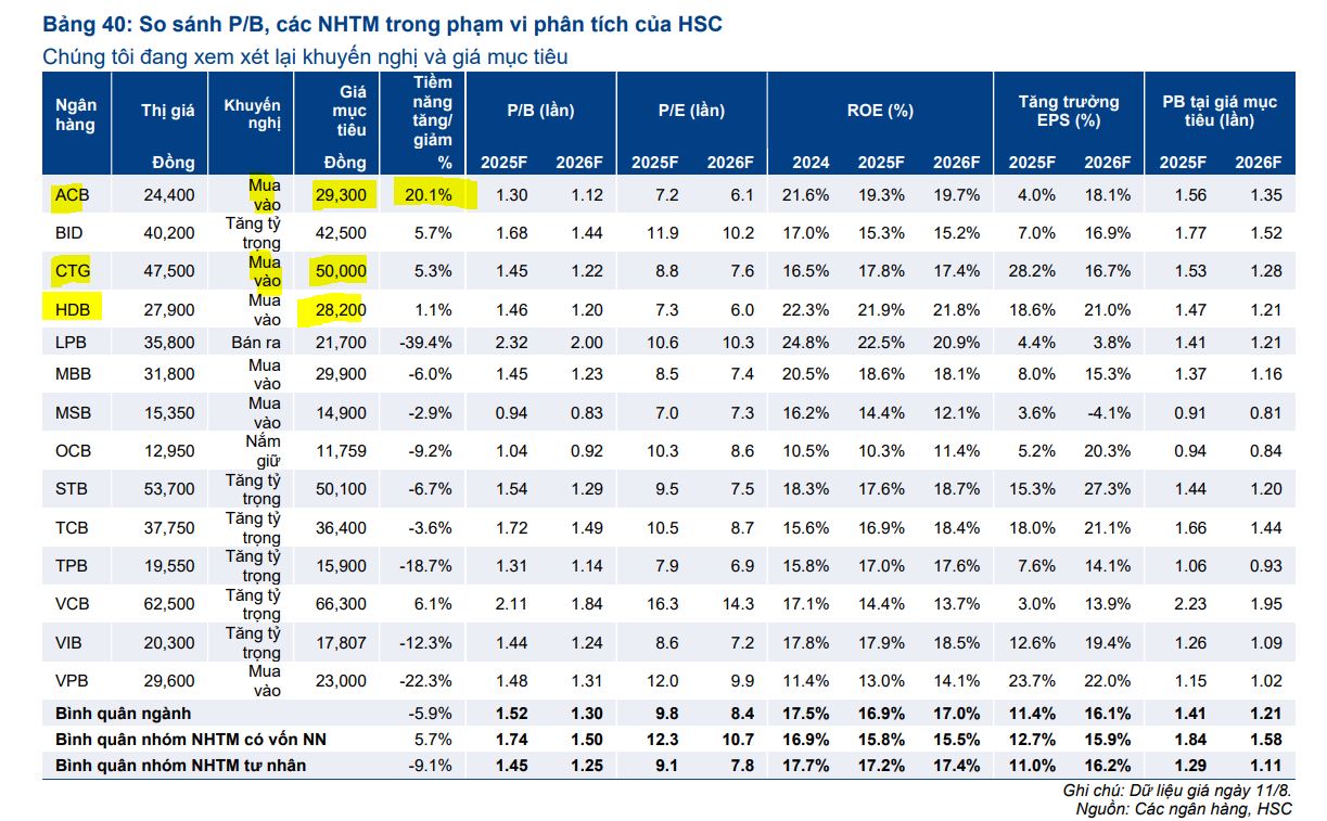 Sau đợt tăng giá này, hầu hết các cổ phiếu ngân hàng hiện đang giao dịch với tỷ lệ P/B dự phóng cao hơn so với mức bình quân trong quá khứ. Do đó, HSC đang xem xét lại khuyến nghị và giá mục tiêu cho nhiều cổ phiếu.