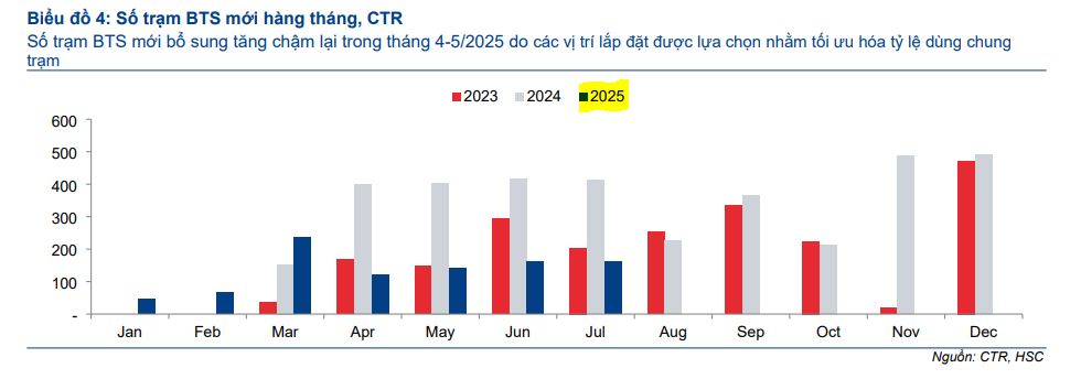 Tối Ưu Hóa Trạm BTS: CTR đang ưu tiên lựa chọn các vị trí lắp đặt có thể sử dụng chung cho nhiều nhà mạng, với mục tiêu nâng tỷ lệ dùng chung trạm từ 1.03 lên 1.045 lần trong năm 2025. Điều này có thể làm chậm tốc độ lắp đặt trạm mới nhưng sẽ giúp tối đa hóa doanh thu cho thuê trong dài hạn.