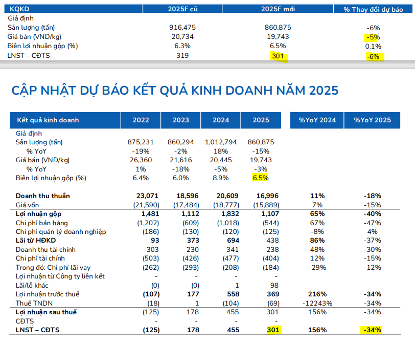 • Kết quả kinh doanh quý II/2025 ảm đạm: Lợi nhuận thuần giảm 58% YoY, lợi nhuận từ hoạt động cốt lõi giảm tới 93%. Doanh thu giảm 33%, sản lượng xuất khẩu giảm 52% do rào cản thương mại và hạn ngạch tại Mỹ, EU.