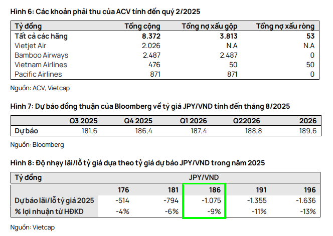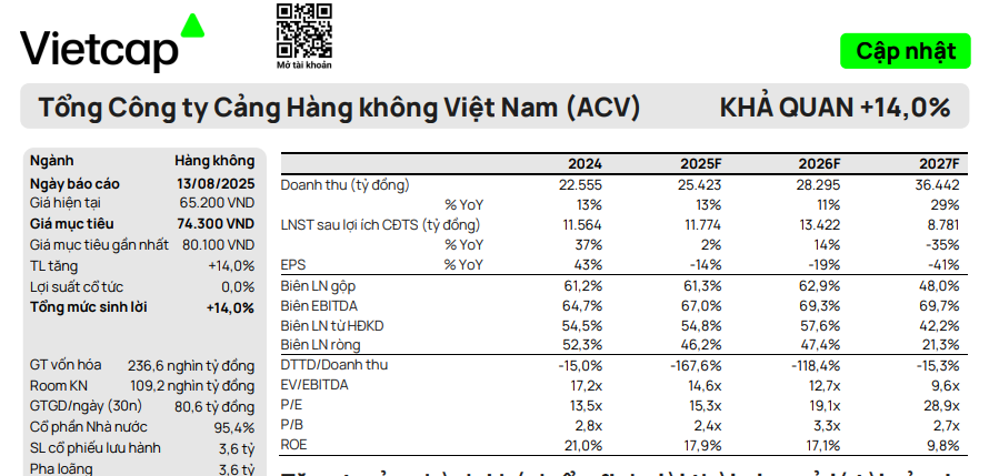 - Vietcap hạ giá mục tiêu ACV xuống 74,300đ/cp và giảm khuyến nghị từ MUA xuống KHẢ QUAN, do điều chỉnh giảm dự báo EBITDA cốt lõi và tăng trưởng hành khách tại Nội Bài thấp hơn kỳ vọng; lợi nhuận sau thuế cũng bị ảnh hưởng bởi hoàn nhập nợ xấu chậm và chi phí khấu hao cao.
