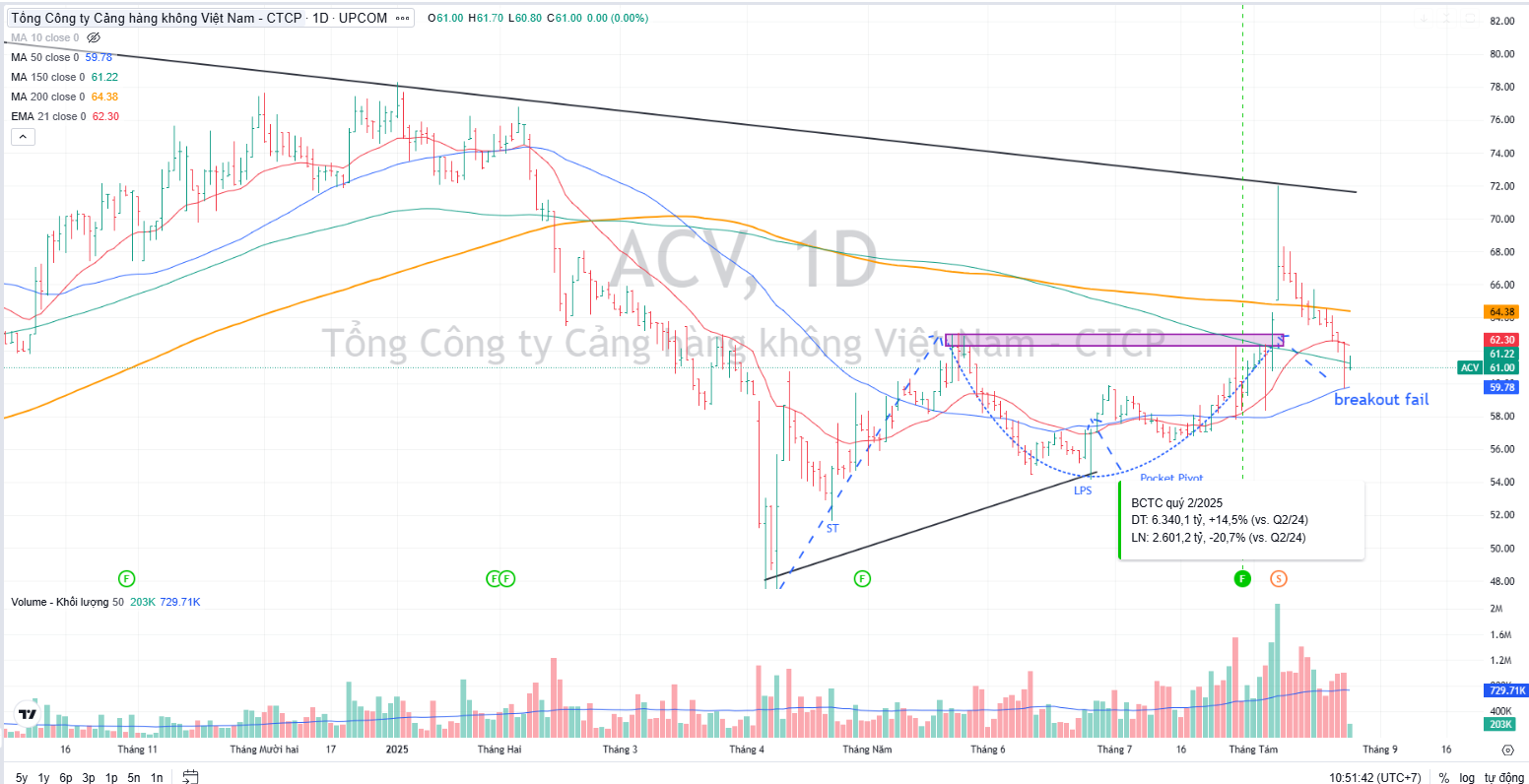 Trên đồ thi, ACV breakout mẫu hình Chiếc Cốc nhưng không thành công bởi gặp ngay kháng cự từ đường trendline. Khả năng ACV phải tích lũy lại quanh MA50 ngày.