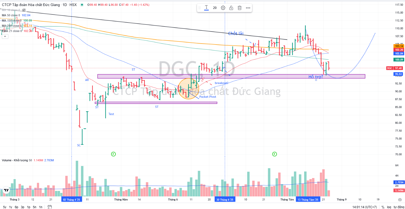 Trên đồ thị, RS của DGC là 34, nằm trong số các cổ phiếu hoạt động yếu trên thị trường. DGC đã nằm dưới MA50 ngày cho thấy đang xây lại nền giá. Nhà đầu tư quan sát vùng hỗ trợ ở mức giá 95.