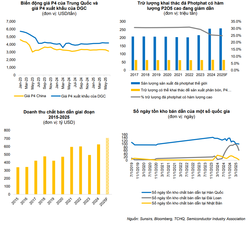 | Phốt pho vàng (P4) | Phục hồi mạnh mẽ nhờ nhu cầu chips và phân bón. Giá P4 xuất khẩu dự kiến tăng 5-7% trong 2025. Tuy nhiên, lo ngại về thuế xuất khẩu P4 tăng lên 10% từ năm 2026 có thể khiến DGC mất thị phần tại Ấn Độ. | Giá P4 phục hồi, dự kiến tăng 6,3% trong 2025. Tác động của thuế xuất khẩu lên 15% vào năm 2027 được cho là không đáng kể, vì thị trường chính là Nhật Bản sẽ được miễn thuế. | Nhận định kết quả kinh doanh quý 2 cho thấy sản lượng P4 tiêu thụ tăng mạnh (+34%), là động lực chính của doanh thu. |