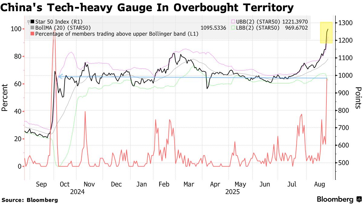 Chỉ số Star 50, vốn có mức độ tiếp xúc lớn với các cổ phiếu chip, là ví dụ điển hình nhất cho đợt tăng giá gần đây. Gần hai phần ba số cổ phiếu thành viên của chỉ số này đang giao dịch cao hơn Dải Bollinger trên, một thước đo biến động phổ biến để xác định xem một cổ phiếu đang bị định giá quá cao hay quá thấp.