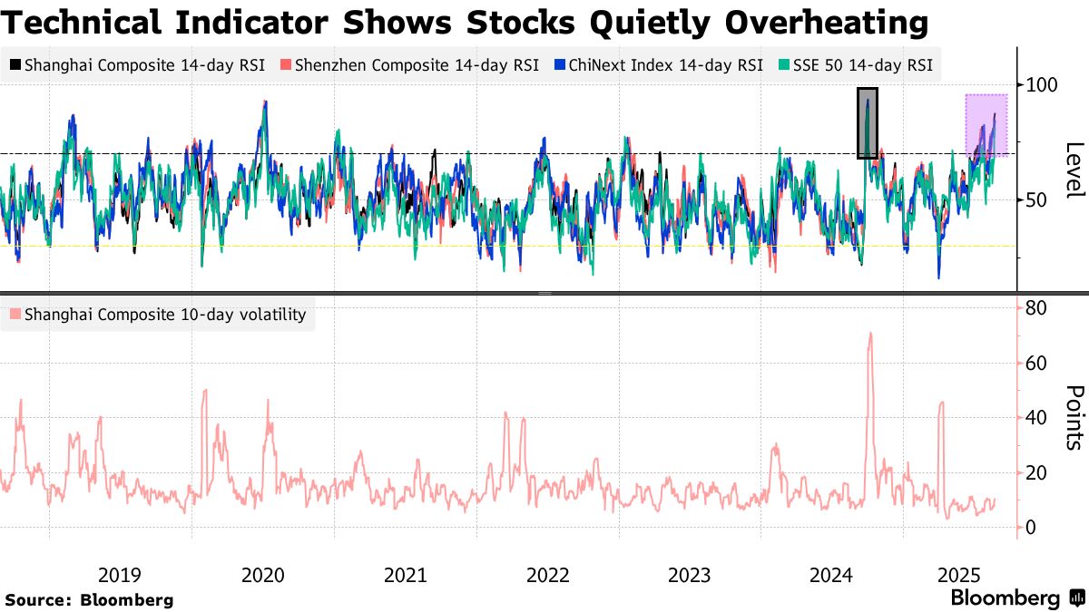 Đà tăng giá đã kéo dài vào thứ Hai, với khối lượng giao dịch trên thị trường chứng khoán lớn thứ hai thế giới đạt 3,100 tỷ nhân dân tệ (433 tỷ USD), mức cao thứ hai từ trước đến nay. Chỉ số CSI 300, tăng phiên thứ tư liên tiếp, nằm trong số những chỉ số tăng trưởng tốt nhất châu Á trong tháng này. Tuy nhiên, các chỉ số từ định giá đến chỉ báo kỹ thuật và tình hình margin đang bắt đầu phát đi những cảnh báo.