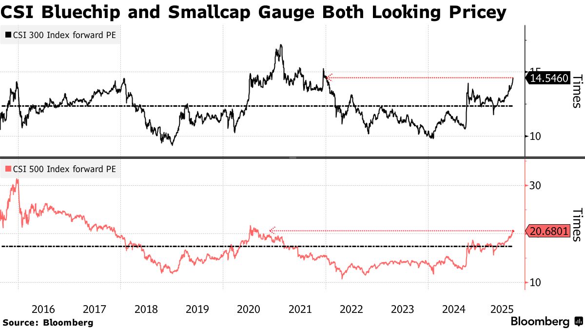Thị trường đang có vẻ ngày càng đắt đỏ sau những đợt tăng giá gần đây. Tăng hơn 13% trong năm nay, CSI 300 đang giao dịch ở mức gần 15 lần thu nhập dự phóng 12 tháng, mức cao nhất kể từ đầu năm 2022 và cao hơn mức trung bình 10 năm là khoảng 12 lần.