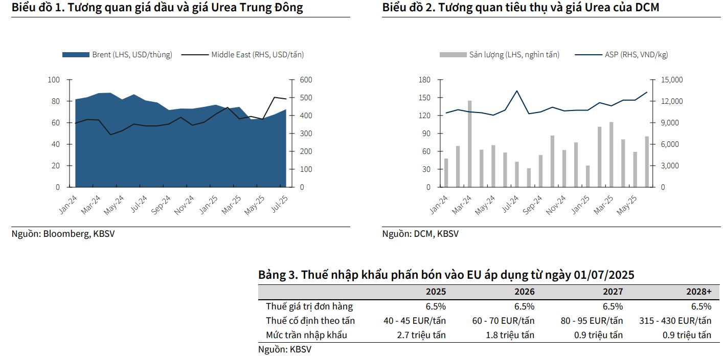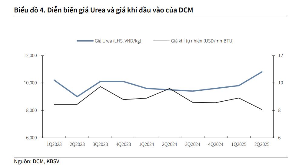 Theo KBSV, động lực chính thúc đẩy tăng trưởng lợi nhuận của DCM là giá urea tăng mạnh, nhờ nguồn cung khí sản xuất tại EU và Trung Đông bị hạn chế do căng thẳng địa chính trị và nhu cầu tiêu thụ lớn từ Ấn Độ. KBSV kỳ vọng giá bán urea trung bình của DCM sẽ đạt 11,400 VND/kg trong năm 2025.