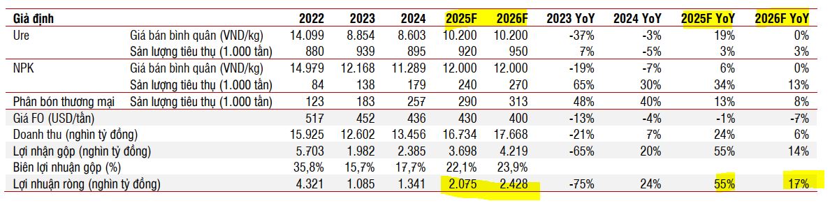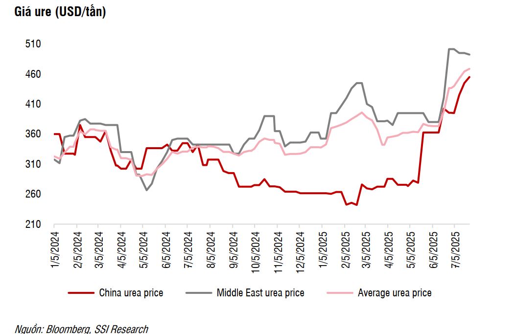 Giá bán Ure bình quân nửa cuối năm 2025 được điều chỉnh tăng từ 374 USD/tấn lên 428 USD/tấn (+14% so với dự phóng trước và +18% so với cùng kỳ năm 2024), chủ yếu nhờ giá Ure thế giới neo ở mức cao.