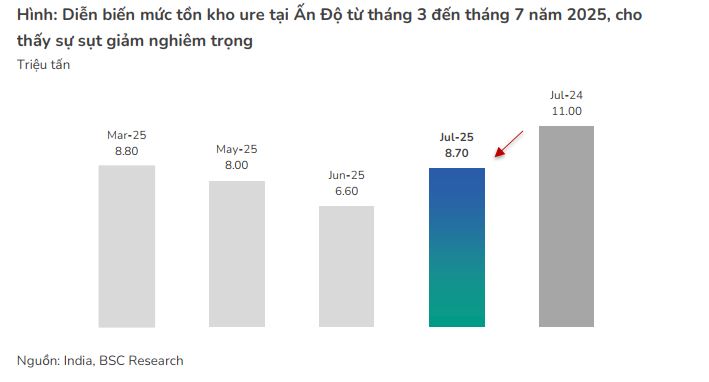 (ii) Nhu cầu tăng mạnh từ Ấn Độ: Nhờ thời tiết thuận lợi và diện tích gieo trồng tăng mạnh trong mùa mưa, nhu cầu ure tại Ấn Độ phục hồi mạnh. Tuy nhiên, các đợt thầu ure hiện tại chỉ đạt 70–75% kế hoạch, buộc nước này phải tổ chức thêm nhiều đợt thầu trong quý III–IV, góp phần giữ giá ure ở vùng cao. Bên cạnh đó, Ấn Độ đang đối mặt với tình trạng tồn kho ure ở mức thấp, tính đến ngày 1 tháng 7/2025, tồn kho ure của Ấn Độ chỉ còn 6.6 triệu tấn, giảm mạnh 40% so với cùng kỳ năm 2024 khi mức tồn kho đạt 11 triệu tấn.