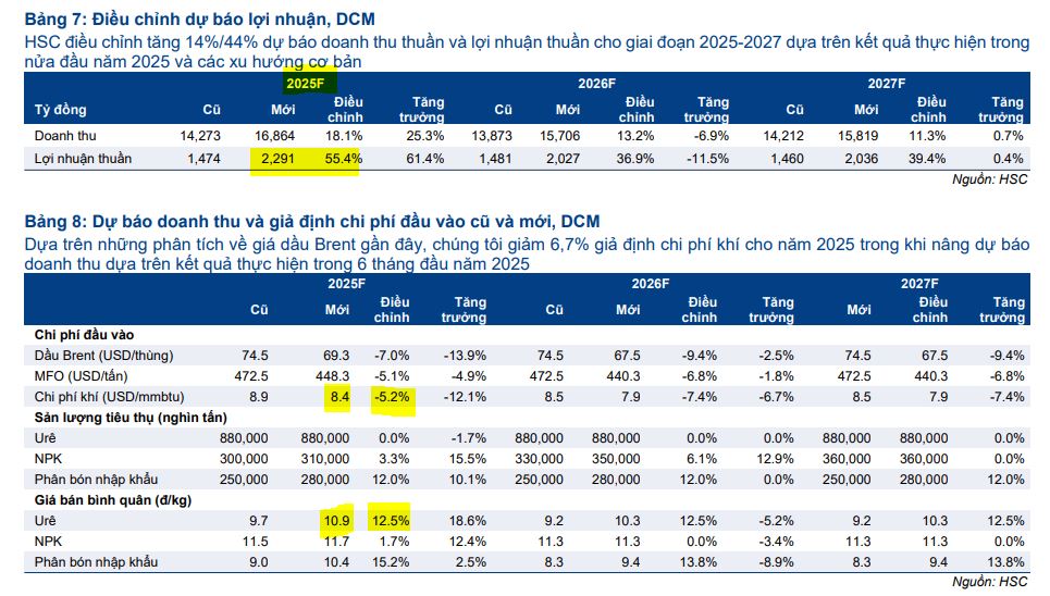 Dựa trên KQKD khả quan nửa đầu năm và các yếu tố thị trường thuận lợi, HSC đã điều chỉnh tăng bình quân 44% dự báo lợi nhuận thuần của DCM cho giai đoạn 2025-2027. Cụ thể: