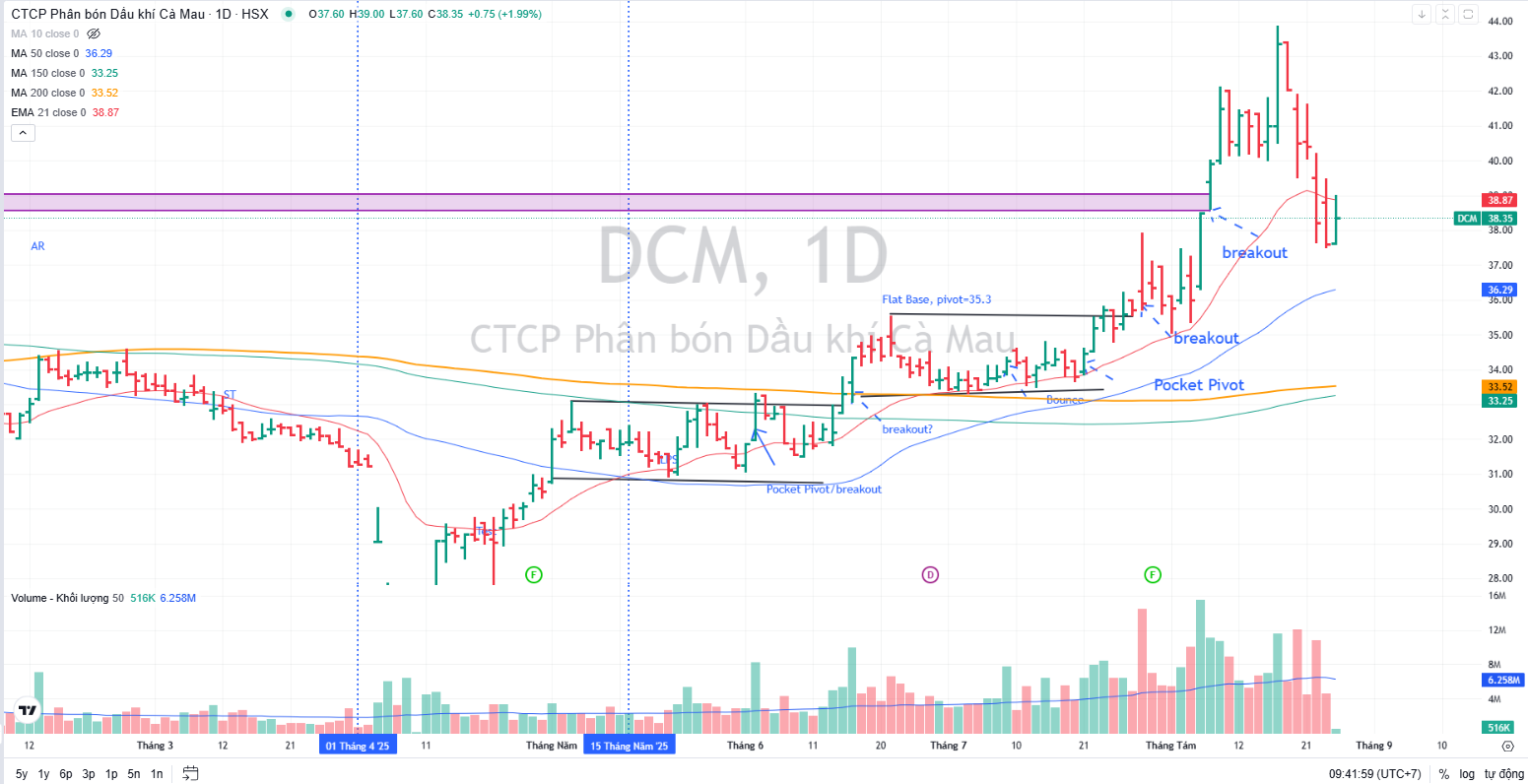 Trên đồ thị, DCM có RS là 78, nằm trong số các cổ phiếu hoạt động khá tốt trên thị trường. Sau khi tăng hơn +23% kể từ điểm breakout Nền Giá Phẳng và thiết lập đỉnh cao mọi thời đại, DCM đng thoái lùi về EMA 21 ngày. Khả năng DCM cần phải về dưới MA50 ngày để xây lại nền giá. Vùng giá 34-35,000 là nơi đáng chú ý để tìm kiếm lực cầu mạnh.