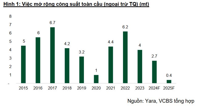 (1) Giới hạn mở rộng công suất: Theo Yara, vệc mở rộng công suất sản xuất urê toàn cầu (không bao gồm Trung Quốc) đã đạt mức đỉnh vào năm 2022 với 6.2 triệu tấn mỗi năm (TPA). Công suất bổ sung toàn cầu sẽ ở mức vừa phải trong giai đoạn 2025-2026, vào khoảng 3.8 triệu tấn, trước khi tăng tốc lên khoảng 14.7 triệu tấn trong giai đoạn 2026-2029.