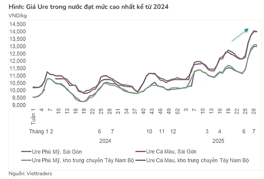 Hiện nay, giá Ure Cà Mau đang giao dịch quanh mức 14,000 VND/kg, cao hơn +36% so với mức kỳ vọng trước, đồng thời tăng +28% so với đầu năm và +35% so với cùng kỳ.