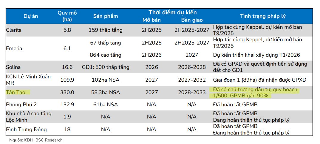 Đối với dự án Khu đô thị Tân Tạo (~330 ha); BSC nhấn mạnh tỷ lệ giải phóng mặt bằng gần 90%, đây là dự án hưởng lợi lớn nếu sửa đổi, bổ sung một số điều của Luật Đất đai 2024 được thông qua theo hướng cho phép Nhà nước thu hồi phần diện tích còn lại khi nhà đầu tư đã thỏa thuận được trên 75% diện tích hoặc số lượng người sử dụng đất – qua đó gỡ nút thắt cho Tân Tạo.