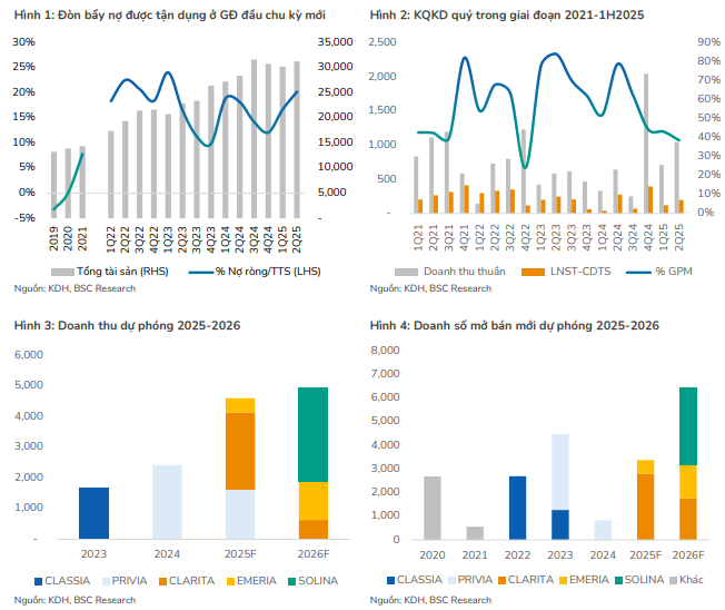 BSC ghi nhận thêm chi tiết thương mại: giá bán trung bình phân khúc thấp tầng của Gladia được giả định khoảng 228 triệu đồng mỗi mét vuông; với mức giá này, doanh số mở bán mới năm 2025 được dự phóng 3,380 tỷ đồng (+309% YoY) tương đương khoảng 100 sản phẩm, qua đó hỗ trợ doanh thu năm 2025 khoảng 4,682 tỷ đồng (+43% YoY) và LNST của cổ đông công ty mẹ năm 2025 khoảng 860–863 tỷ đồng