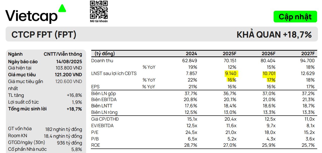 Vietcap (14.8.2025) đã điều chỉnh nhẹ giá mục tiêu đối với cổ phiếu FPT lên 121,200 đồng/cổ phiếu, nhưng hạ khuyến nghị từ MUA xuống KHẢ QUAN. Sự điều chỉnh này phản ánh việc dự báo lợi nhuận sau thuế của cổ đông thiểu số trong giai đoạn 2025-26 giảm 2%.