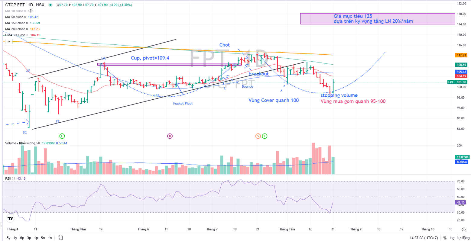 Trên đồ thị, FPT đang có phiên Stopping Volume vào ngày 20.8.2025. Nếu đánh nhãn này là chính xác kỳ vọng FPT sẽ có sự phục hồi nhẹ, nhưng sẽ còn kiểm tra lại vùng giá 100,000 để kiểm tra lực cầu. Elibook Team khuyến nghị mua gom FPT ở vùng giá 95,000-100,000 đồng.