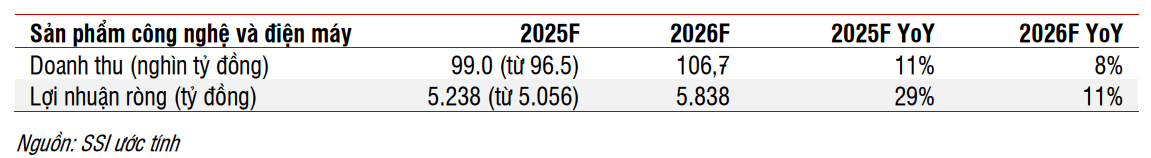 Ở cấp mảng, công nghệ–điện máy dự phóng doanh thu 2025 là 99,000 tỷ đồng (+11% YoY), lợi nhuận ròng 5,238 tỷ đồng (+29% YoY); năm 2026 doanh thu 106,700 tỷ đồng (+8% YoY), lợi nhuận ròng 5,838 tỷ đồng (+11% YoY).