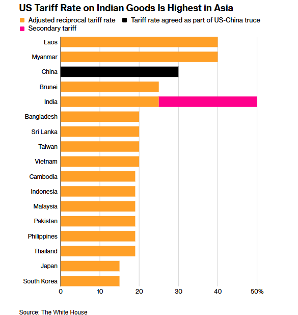 Tổng thống Donald Trump đã áp mức thuế nặng nề 50% đối với một số mặt hàng xuất khẩu từ Ấn Độ, mức cao nhất ở châu Á, nhằm trừng phạt New Delhi vì mua dầu của Nga, động thái đảo ngược nỗ lực kéo dài hàng thập kỷ của Washington trong việc thắt chặt quan hệ với Ấn Độ.