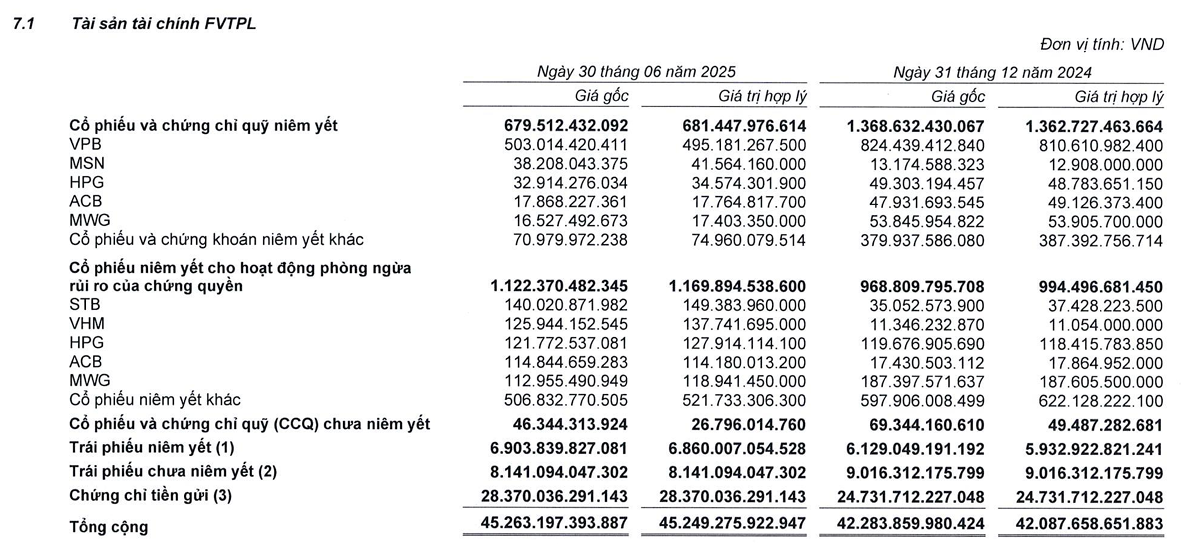Đối với SSI, nửa đầu năm 2025 cho thấy chiến lược tự doanh chuyển hẳn từ hoạt động mua–bán cổ phiếu ngắn hạn sang ưu tiên quản lý rủi ro và ổn định dòng tiền. Cụ thể, giá trị danh mục ghi nhận lãi/lỗ (FVTPL) ở phần cổ phiếu giao dịch đã giảm một nửa, từ 1,362.7 tỷ xuống 681.4 tỷ đồng, khi SSI bán mạnh VPBank và hầu hết các cổ phiếu khác chỉ giữ lại vị thế nhỏ tại MSN.