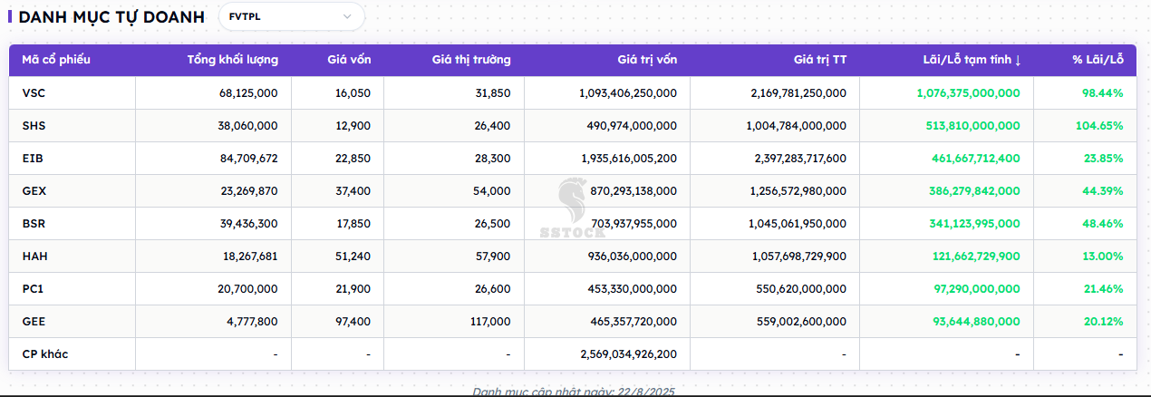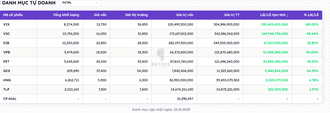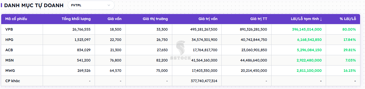 Tính tới ngày 22/8/2025, danh mục tự doanh FVTPL của SSI đang có lợi nhuận tạm tính khoảng 413.3 tỷ đồng, tức khoảng +68.2% trên tổng vốn bỏ ra cho 5 mã. Trong đó VPB đóng góp 396.1 tỷ, chiếm khoảng 95.8% tổng lãi. Nói cách khác, danh mục đang “ăn” nhờ một lần tăng giá đột biến của VPB; các mã còn lại (HPG, ACB, MSN, MWG) chỉ đóng góp cục bộ nhỏ giọt, tổng lại không sánh nổi với một phần lợi nhuận của VPB.