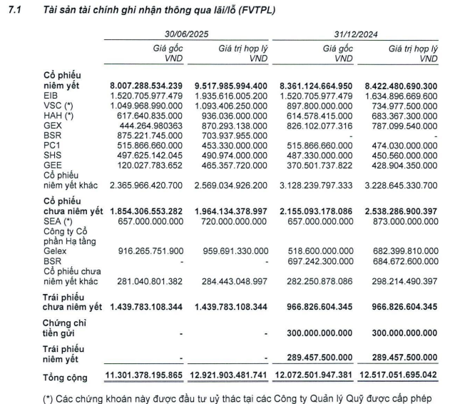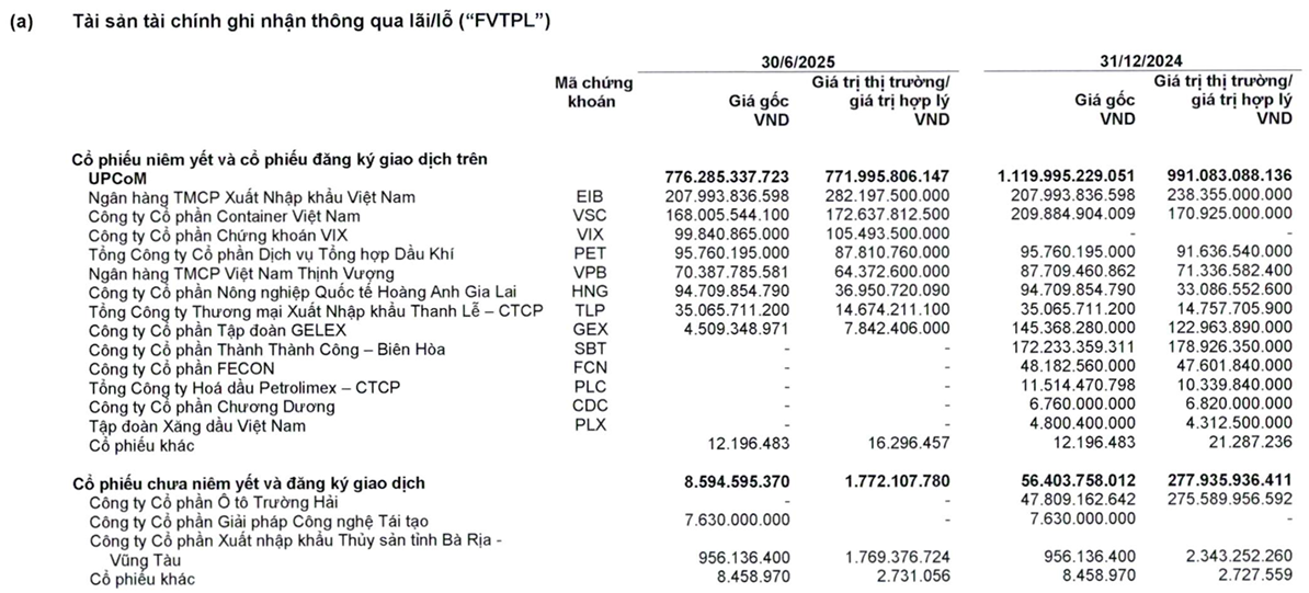 Nửa đầu năm 2025, VIX đã thực hiện tái cấu trúc danh mục FVTPL: giá gốc danh mục giảm khoảng 771.1 tỷ đồng trong khi giá trị hợp lý tăng khoảng 404.9 tỷ đồng. Diễn biến này cho thấy hoạt động thoái vốn/tái phân bổ đã diễn ra đồng thời một số mã chính tiếp tục được đánh giá lại tích cực.