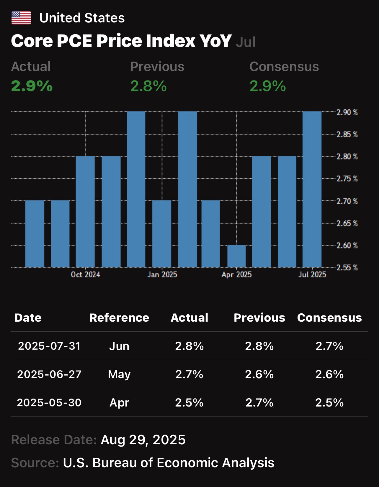 Chỉ số giá chi tiêu tiêu dùng cá nhân (PCE) cho thấy lạm phát cơ bản ở mức 2.9% theo năm đã điều chỉnh theo mùa trong tháng 7, đạt ước tính nhưng cao hơn tháng 6.