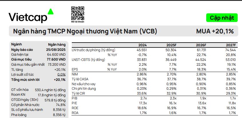 Theo phân tích của Vietcap, Ngân hàng TMCP Ngoại thương Việt Nam (VCB) đang có triển vọng tăng trưởng tích cực, với hai động lực chính là đà tăng trưởng tín dụng mạnh mẽ và sự phục hồi của NIM (biên lãi ròng). Vietcap duy trì khuyến nghị MUA và nâng giá mục tiêu lên 77,600 đồng/cổ phiếu. Vietcombank được cho là hưởng lợi từ việc xóa bỏ độc quyền sản xuất vàng miếng và có thể tham gia lập sàn giao dịch vàng.