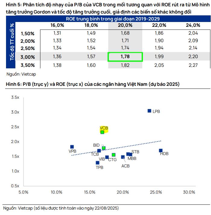 VCB hiện đang giao dịch với P/B dự phóng năm 2025 là 2.32 lần, cao hơn 46% so với mức trung vị P/B năm 2025 của các ngân hàng khác là 1.59 lần với ROE dự phóng năm 2025 là 16.9%, so với mức trung vị ngành là 18,6% (Hình 7).