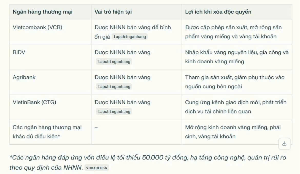 VCB có lợi thế lớn trong sản xuất vàng miếng: Với vốn điều lệ trên 50,000 tỷ đồng, VCB thuộc nhóm ngân hàng đủ điều kiện để được cấp phép sản xuất vàng miếng theo Nghị định 232/2025/NĐ-CP, mở ra cơ hội gia tăng thu nhập ngoài lãi.