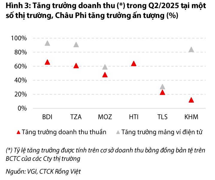 Khu vực Châu Phi tiếp tục là động lực tăng trưởng chính, đóng góp hơn 51% doanh thu quý 2. Các thị trường như Burundi, Tanzania và Mozambique ghi nhận mức tăng trưởng ấn tượng, lần lượt đạt 66%, 61% và 48%. Bên cạnh đó, mảng dịch vụ số, đặc biệt là ví điện tử, cũng ghi nhận mức tăng trưởng trên 80% tại nhiều thị trường như Burundi, Tanzania và Campuchia.