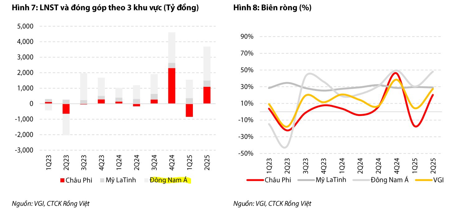 Về triển vọng, VGI đang triển khai mạng 5G tại Đông Timor, Burundi và Tanzania, đồng thời ra mắt ví điện tử u-money và dịch vụ gửi tiết kiệm online tại Lào. Dù tỷ trọng doanh thu từ Đông Nam Á có xu hướng giảm nhẹ, khu vực này vẫn duy trì biên lợi nhuận ròng cao nhất, đạt 48%. Công nghệ 4G tiếp tục được nâng cấp ở Châu Phí với lộ trình nâng độ phủ tại Burundi lên 70%, trng khi 5G đã được chính thức triển khai tại Đông Nam Á, mới đây nhất là thị trường Đông Timor.